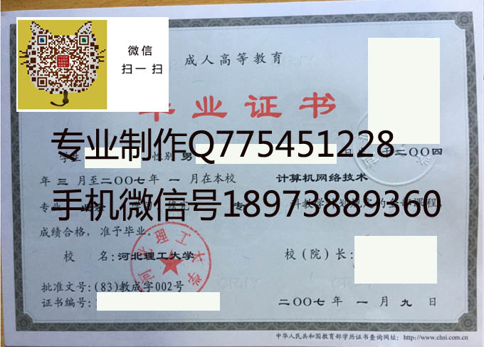 河北理工大学2007年成人毕业证样本