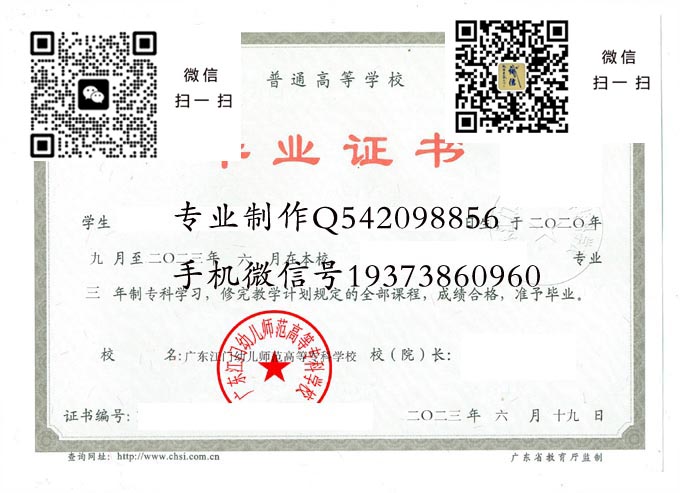 广东江门幼儿师范高等专科学校历年毕业证样本